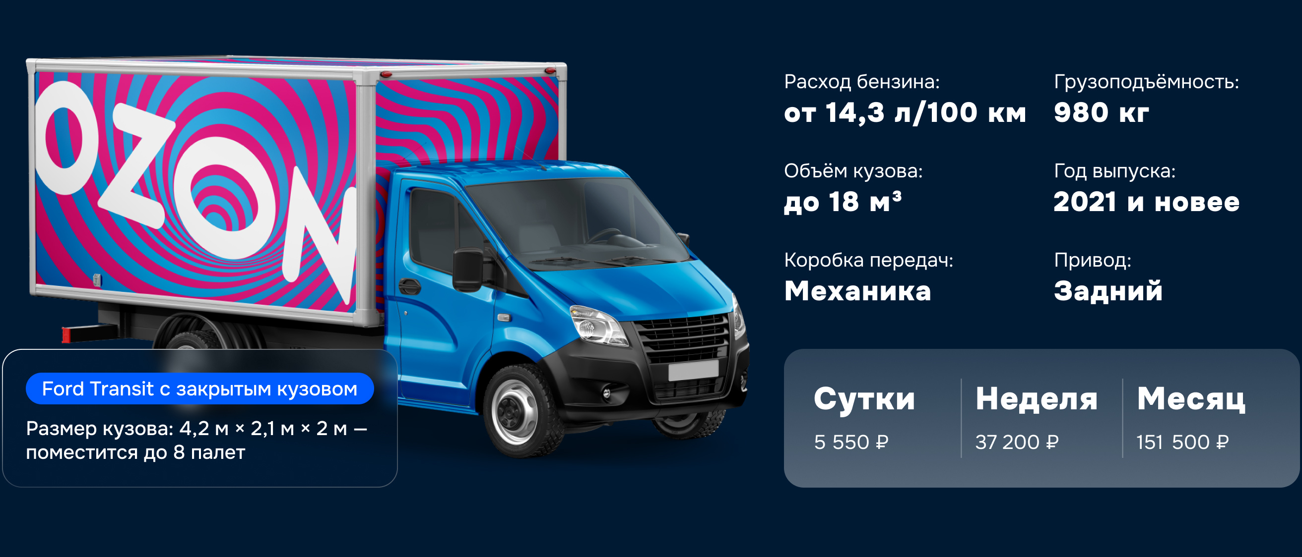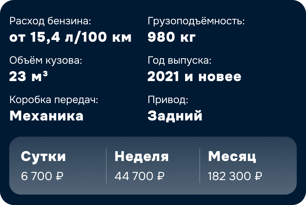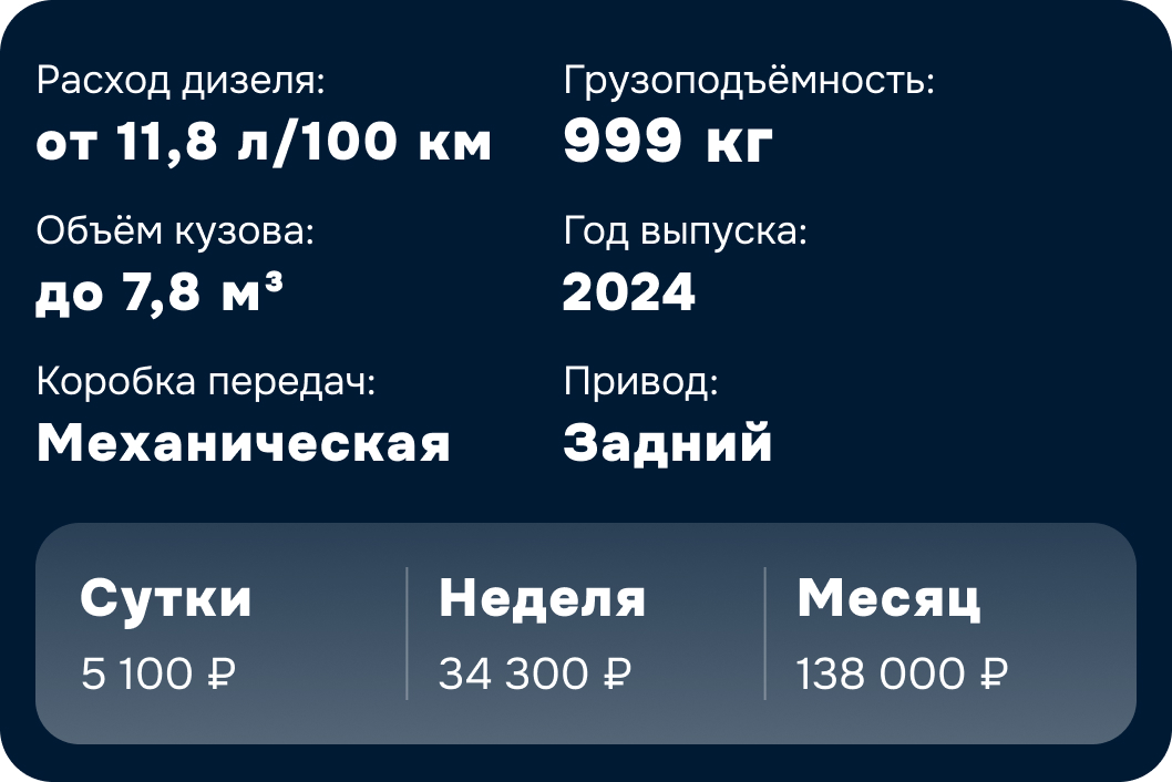 150 км в сутки для Gazel Next 10п и Ford Transit 8п и 120 км в сутки для Gazel Next ЦМФ и Соболь NN. Перепробег оплачивается дополнительно — 10,8 ₽/км для всех моделей транспортных средств.
